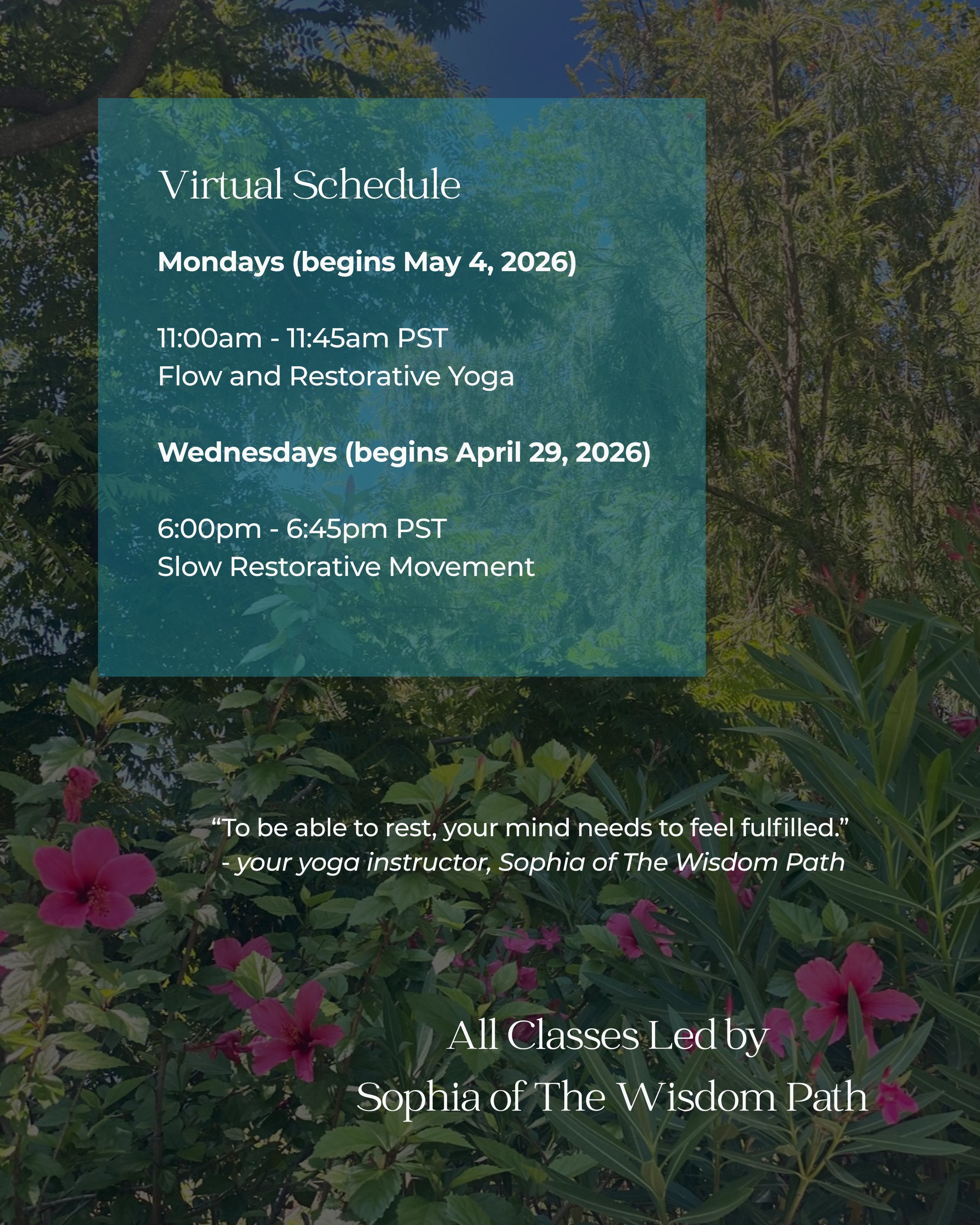 As a Sound Meditation Practitioner, Certified Yoga Instructor, and Retreat Leader, Sophia will always have her students in mind. That has always been the focus and her long term students across the years know this. The trust a student has in our experiences is never taken for granted.